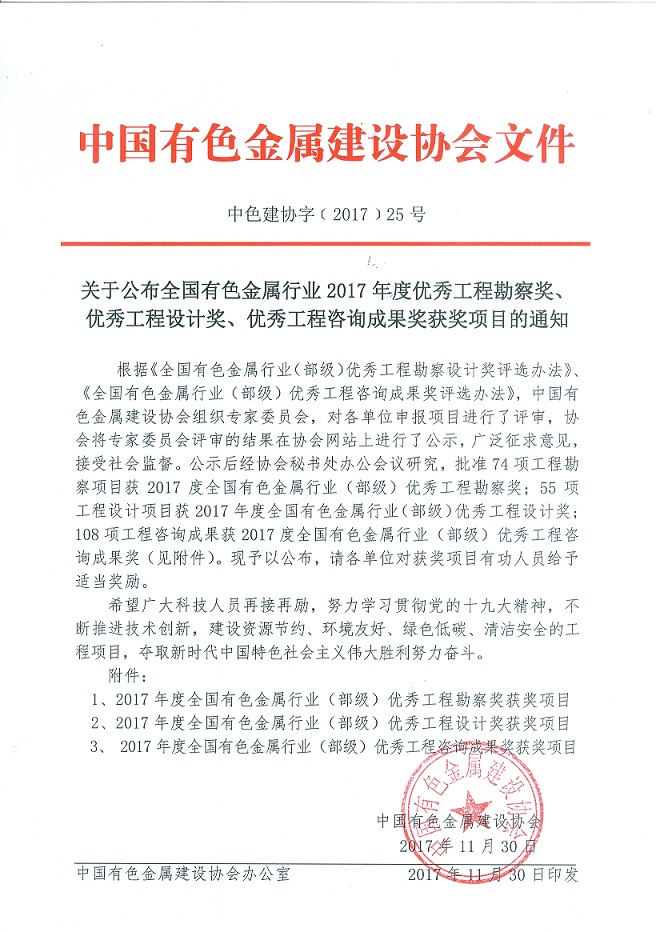 熱烈祝賀我公司兩項目榮獲全國有色金屬行業(yè)2017年度優(yōu)秀工程勘察獎