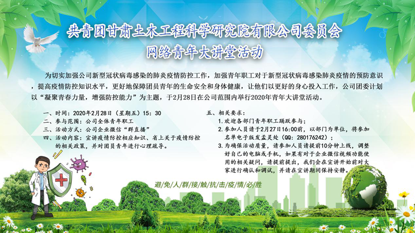 2月28日,公司團(tuán)委主辦的“網(wǎng)絡(luò)青年大講堂” 以在線直播的方式在土木院企業(yè)微信群開講,共有近百名青年團(tuán)員收看了直播。