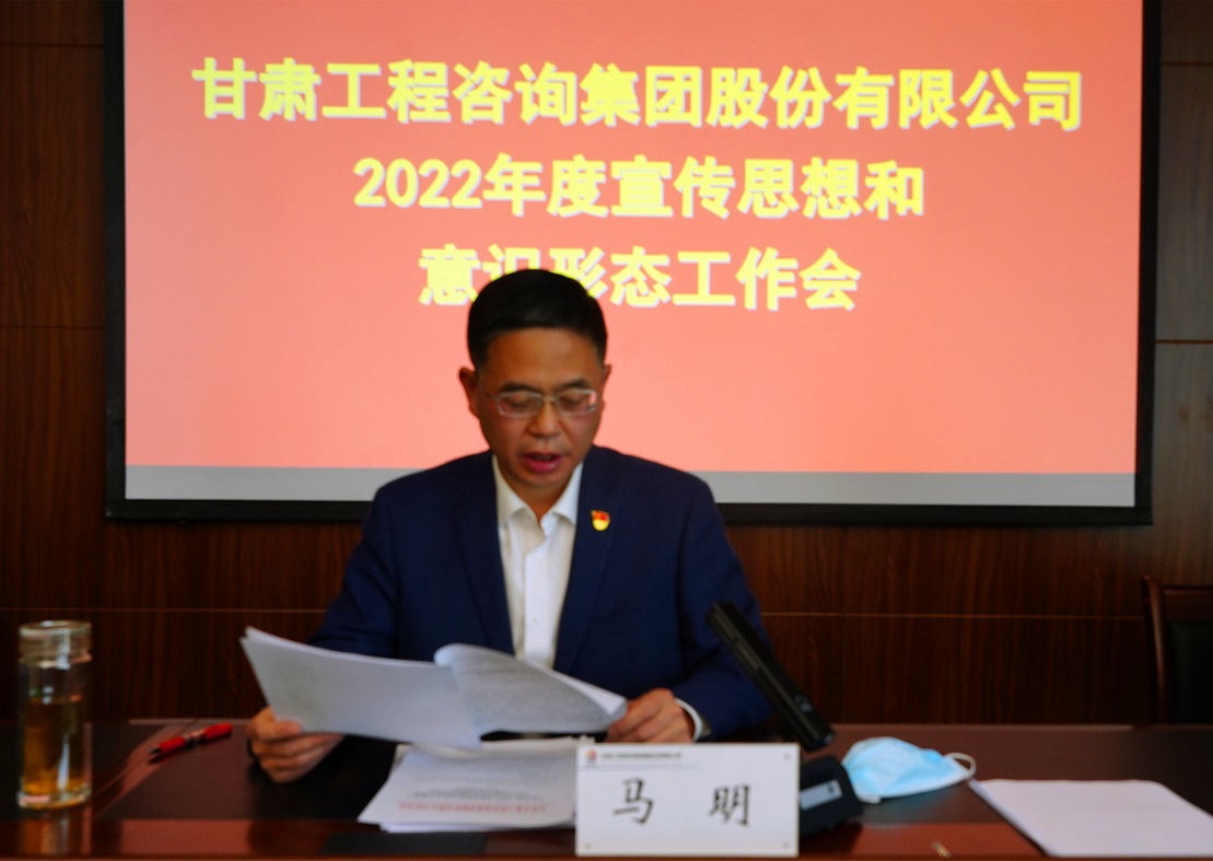 3月28日,甘肅工程咨詢集團(tuán)召開(kāi)2022年度宣傳思想和意識(shí)形態(tài)工作會(huì)議,傳達(dá)學(xué)習(xí)了全國(guó)、全省宣傳部長(zhǎng)會(huì)議精神,黨委副書(shū)記王春燕總結(jié)了2021年度宣傳思想和意識(shí)形態(tài)工作情況并安排部署2022年度工作,黨委副書(shū)記、總經(jīng)理馬明作講話。黨委委員、監(jiān)事會(huì)主席焦軍毅主持會(huì)議,集團(tuán)公司領(lǐng)導(dǎo)班子成員,相關(guān)部門(mén)負(fù)責(zé)人在主會(huì)場(chǎng)參加,各子公司黨委書(shū)記、董事長(zhǎng)(執(zhí)行董事)、總經(jīng)理、黨委副書(shū)記,相關(guān)部門(mén)負(fù)責(zé)人在分會(huì)場(chǎng)參加。