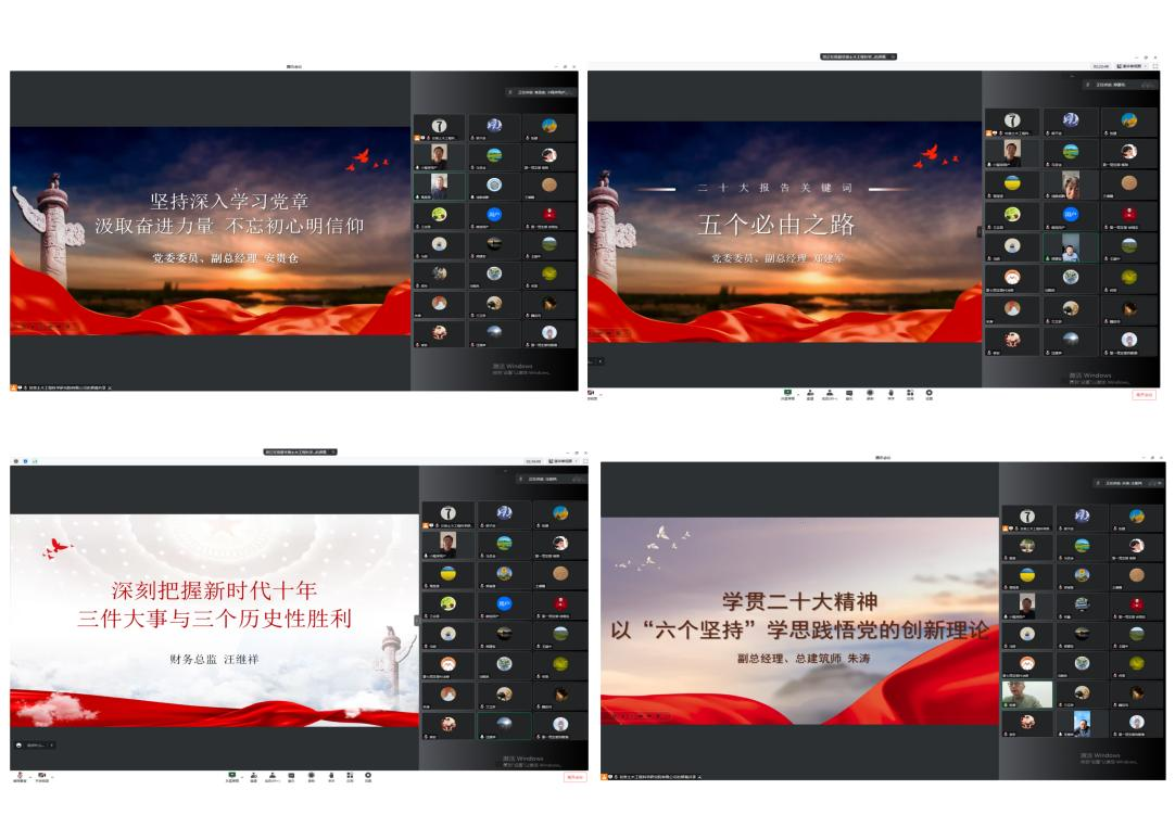 會議強調(diào),要按照上級部門統(tǒng)一部署,完善學(xué)習(xí)方案、明確學(xué)習(xí)內(nèi)容、細化具體措施,將學(xué)習(xí)宣傳貫徹黨的二十大精神抓實抓好抓出成效。公司黨委要堅持以上率下,深化宣傳發(fā)動,通過黨委專題學(xué)習(xí)、理論中心組集體學(xué)習(xí)等形式,引領(lǐng)學(xué)習(xí)貫徹黨的二十大精神落地生根。各黨支部“三會一課”、主題黨日活動為載體,采取“集體學(xué)習(xí)+個人自學(xué)”“線上+線下”相結(jié)合等多種方式,組織全體黨員讀原文、悟?qū)嵸|(zhì),利用宣傳櫥窗、橫幅標(biāo)語、電子屏等方式開展宣傳學(xué)習(xí)、營造氛圍;結(jié)合工作崗位撰寫學(xué)習(xí)體會,踴躍參與交流討論,分享學(xué)習(xí)成果,積極收聽收看視頻講座,深刻領(lǐng)會黨的二十大精神要義,切實增強學(xué)習(xí)宣傳貫徹黨的二十大精神的思想自覺、政治自覺和行動自覺。