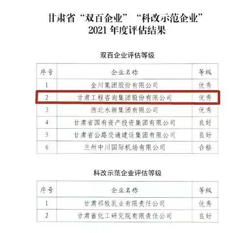 甘肅工程咨詢集團獲甘肅省2021年度“雙百企業(yè)”評估“優(yōu)秀”等級