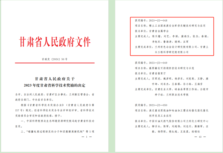 近日,2023年度甘肅省科學(xué)技術(shù)獎結(jié)果揭曉,公司和蘭州有色冶金設(shè)計研究院有限公司聯(lián)合申報的科技成果項目《稀土工業(yè)固液廢安全貯存關(guān)鍵技術(shù)研究與應(yīng)用》榮獲2023年度甘肅省科技進(jìn)步獎二等獎。