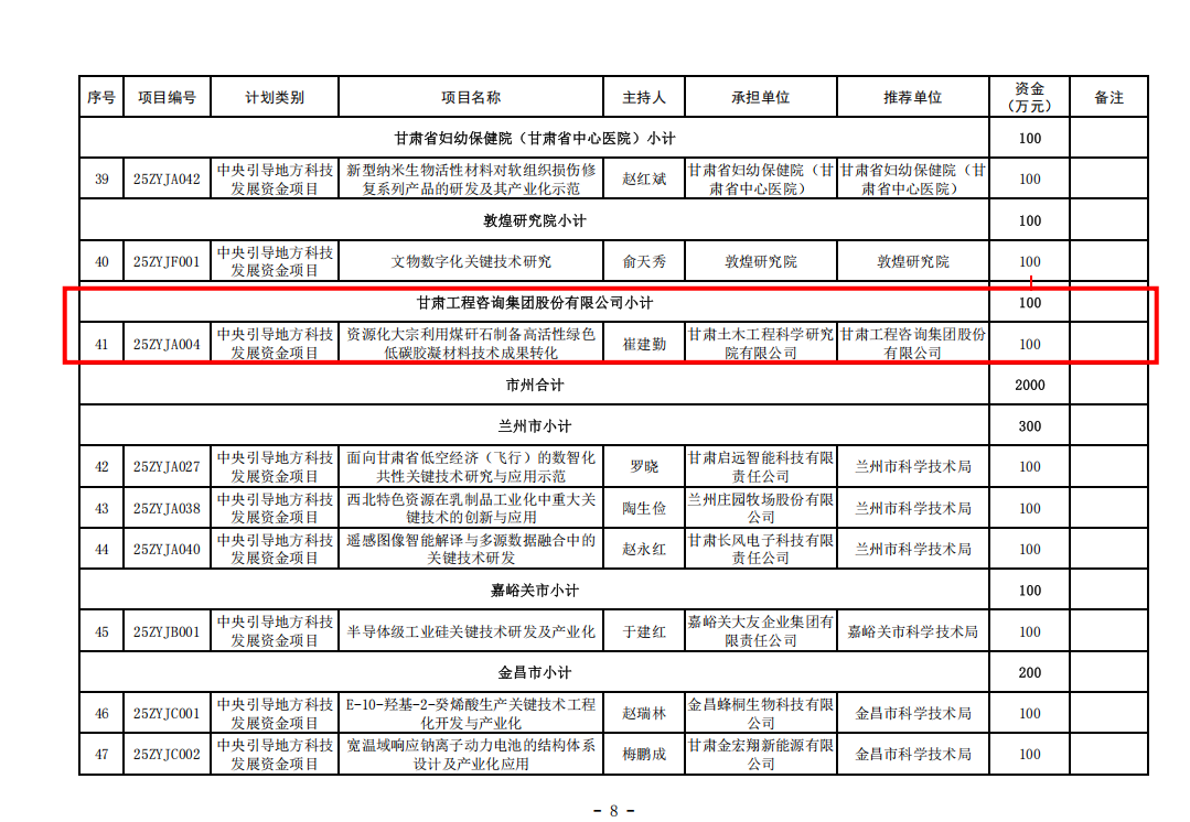 近日,甘肅省科技廳公布了2025年度科技重大專項計劃(中央引導(dǎo)地方科技發(fā)展資金項目)立項名單,我公司主持申報的“資源化大宗利用煤矸石制備高活性綠色低碳膠凝材料技術(shù)成果轉(zhuǎn)化”項目成功立項,標(biāo)志著公司在煤矸石資源化利用領(lǐng)域取得重大突破,將為推動甘肅省綠色低碳發(fā)展貢獻力量。