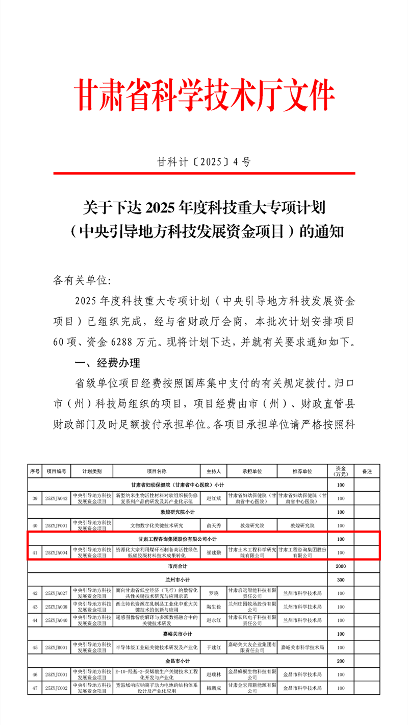 近日,甘肅省科技廳公布了2025年度科技重大專(zhuān)項(xiàng)計(jì)劃(中央引導(dǎo)地方科技發(fā)展資金項(xiàng)目)立項(xiàng)名單,甘肅工程咨詢(xún)集團(tuán)土木工程院主持申報(bào)的“資源化大宗利用煤矸石制備高活性綠色低碳膠凝材料技術(shù)成果轉(zhuǎn)化”項(xiàng)目成功立項(xiàng)。