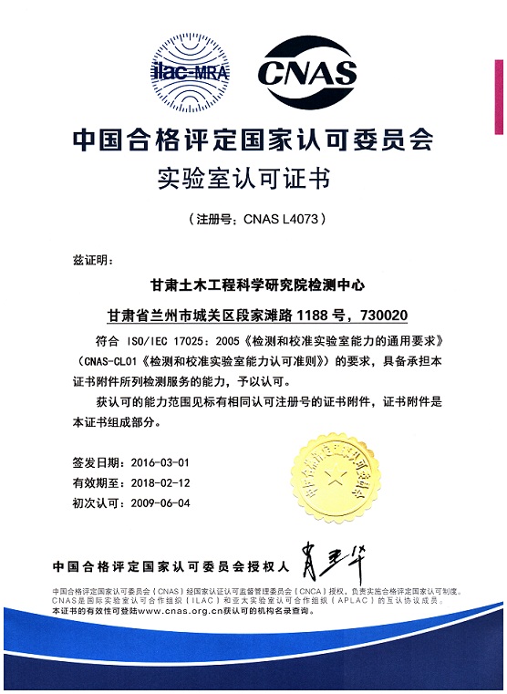 2008年2月首次依據(jù)CNAS-CL01建立了實驗室質(zhì)量管理體系,2009年8月首次通過CNAS實驗室認可,具有建材、節(jié)能、室內(nèi)環(huán)境、結(jié)構(gòu)、地基基礎(chǔ)檢測能力。歷經(jīng)監(jiān)督檢查、換證復(fù)評審,持續(xù)有效運行8年。